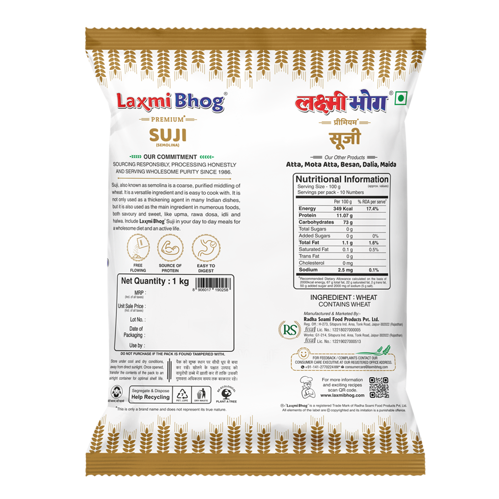 Suji, also known as rawa or semolina is a coarse, purified middling of wheat. A good source of iron, phosphorous, zinc and magnesium, Suji helps in improving our cardiovascular health, prevents anemia and keeps our bones and nervous system healthy. Being rich in protein and fiber, Suji helps boost energy, thereby increasing the feeling of fullness between meals. In the Indian kitchens, it is extensively used for making upma, khichdi, rawa dosa, idli and halwa. Add Laxmi Bhog Suji in your day to day meals for a wholesome diet and an active life.